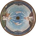 On its ceiling lies a spectacular mosaic by Leon Kroll. Completed in 1953, it comprises 500,000 tiles and tells a full round story “of war and peace.” One side depicts Columbia (Goddess of Liberty) allegorically representing America blessing “her rifle-bearing son before he departs to fight overseas. Above him, a warship and a bomber push through sea and air toward land on the opposite side of the dome. There, a red-capped Marianne figure personifying France bestows a laurel wreath upon the same young man. His now lifeless body leans against her as she cradles his head in her lap. Above them, the return of peace is illustrated with an angel, a dove and a homeward-bound troop ship.” [8] These two figures can be seen again as statues, guarding the end of the cemetery.[9]
