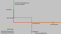 | Connections |  SEPTA Suburban Bus: 90, 91, 93, 96, 97, 98, 99, 131  theconnector Schuylkill River Trail | |||||||||||||||||||||||||||||||||||||