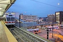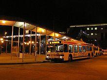 Norristown Transportation Center is a two-level multimodal public transportation regional hub located in Norristown, Pennsylvania, USA, operated by SEPTA. It opened in 1989 to replace the older Norristown High Speed Line (Route 100) terminus one block away at Main and Swede Streets, and integrated the former Reading Company DeKalb Street Norristown railroad station (built 1933) into its structure. A plaque embedded in the sidewalk (between the bus lane and Lafayette Streets) commemorates the location of one of the columns of the dismantled segment of the Philadelphia and Western Railroad (P&W) trestle.