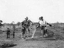 The railway experienced very heavy, damaging traffic during the war since it was a strategic route to operations north of Australia. Larrimah, nine kilometres north of Birdum, became the effective railhead because, unlike Birdum, it was on the Stuart Highway.[note 2] In 1944, as many as 147 trains ran per week.[8]