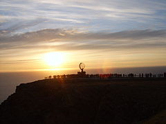 The North Cape became a popular tourist destination during the last decades of the nineteenth century, especially after King Oscar II's visit in 1873.[5] Regular coastal steamer routes from Germany to Northern Norway established in this period facilitated these visits, and Thomas Cook & Son began arranging tours to the destination as early as 1875.[5] Tourists who climbed the cape would often do so using a path equipped with wired ropes from Hornviken.[5] They would often celebrate the visit with the writing of postcards, so-called "Cape cards", gazing at the midnight sun.[5]
