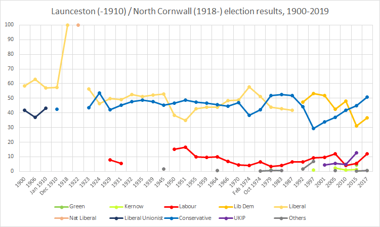 A third-placed (other party) candidate has not polled more in North Cornwall than 16.38%, which took place in 1951. The seat saw three years of defection of its Liberal MP to join the post-World War II Attlee Ministry however in 2015 saw the lowest share of the Labour Party's vote nationally – reinforcing a consistent result by a great majority supporting left-wing politics to vote for a Liberal and later Liberal Democrat at general elections since the seat's inception.