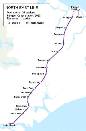 The North East line (NEL) is the shortest Mass Rapid Transit line in Singapore. It is a high-capacity line, and runs from HarbourFront in the south-west to Punggol in the north-east. It is 19.2 kilometres (11.9 mi) long with 16 stations.[2] Due to its rather short length, a full journey on the North East Line from one end to the other takes just about 30 minutes.[3] The line is coloured purple on the rail map.