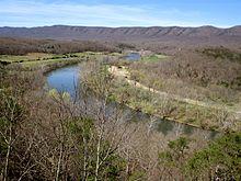The Shenandoah River /ˌʃɛnənˈdoʊə/ is a tributary of the Potomac River, 55.6 miles (89.5 km) long with two forks approximately 100 miles (160 km) long each,[3] in the U.S. states of Virginia and West Virginia. The principal tributary of the Potomac, the river and its tributaries drain the central and lower Shenandoah Valley and the Page Valley in the Appalachians on the west side of the Blue Ridge Mountains, in northwestern Virginia and the Eastern Panhandle of West Virginia.[1]