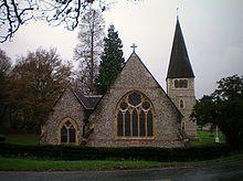 A parish of Holmwood was created from parts of Dorking and Capel parishes in 1839.[4] The parish church was built of flint in Early English style and consecrated in 1875.[5] The tower contains two bells and a clock. The east window of the chancel has stained glass from 1874 made by Messrs Powell of White Friars. The west windows of the chancel have glass designed by Charles Eamer Kempe from 1891 showing the four Fathers of the Western Church.[4][6]