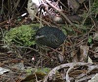 The North Island robin, like the South Island robin, is a terrestrial feeder foraging on or near the ground (unlike the related and more arboreal tomtit). Prey items are located by perch-hunting, where an individual waits at an elevated perch until prey is spotted, or by active searching; prey is taken from the leaf-litter, low vegetation (branches and foliage), and tree trunks. Numerous invertebrate prey are taken, including cicadas, earthworms, wētā, snails, and spiders. Fruit is also taken.[4] North Island robins cache food supplies for later when prey is plentiful, although males cache more food than females do.[8] Both sexes will steal food from their mate's cache, and are less likely to cache food, if their mate is present.