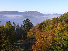 The terrain rises towards the south and in the east of the state into parts of Germany's Central Uplands. These hill ranges are the Weser Uplands – including the Egge Hills, the Wiehen Hills, the Wesergebirge and the Teutoburg Forest in the east, the Sauerland, the Bergisches Land, the Siegerland and the Siebengebirge in the south, as well as the left-Rhenish Eifel in the southwest of the state. The Rothaargebirge in the border region with Hesse rises to height of about 800 m above sea level. The highest of these mountains are the Langenberg, at 843.2 m above sea level, the Kahler Asten (840.7 m) and the Clemensberg (839.2 m).