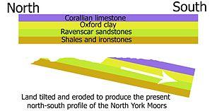 Subsequently, about 30 million years ago, the land was uplifted and tilted towards the south by earth movements. The upper layers of rock were eroded away and the older rocks were exposed in places. Because of the tilt the oldest rocks became exposed in the north. These are the bands of shales and ironstones on the northern scarp of the moors and Cleveland Hills. The middle layers form the sandstones of the high moors and the youngest layers of limestone form the tabular hills. In the dales where the rivers have cut through the younger rocks there are also exposures of older shales, ironstone and sandstone. Rosedale is an example of this.[14]