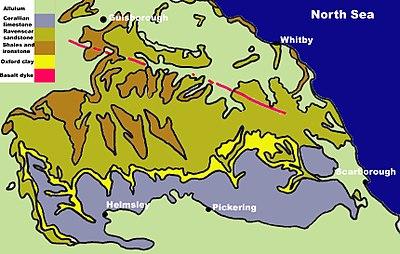 The geology of the North York Moors is dominated by rocks of the Jurassic period. They were mostly laid down in subtropical seas 205 to 142 million years ago. Fluctuations in sea level produced different rock types varying from shales to sandstones and limestones derived from coral. These marine and delta deposited rocks are well exposed on the Yorkshire coast from Staithes to Filey.