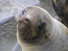 Northern fur seals have extreme sexual dimorphism, with males being 30–40% longer and more than 4.5 times heavier than adult females.[1] The head is foreshortened in both sexes because of the very short, down-curved muzzle, and small nose, which extends slightly beyond the mouth in females and moderately in males. The pelage is thick and luxuriant, with a dense underfur in a creamy color. The underfur is obscured by the longer guard hairs, although it is partially visible when the animals are wet. Features of both fore and hind flippers are unique and diagnostic of the species. Fur is absent on the top of the fore flippers and an abrupt "clean line" is seen across the wrist where the fur ends.[5] The hind flippers are proportionately the longest in any otariid because of extremely long, cartilaginous extensions on all of the toes.[5] Small claws are on digits 2–4, well back from the flap-like end of each digit. The ear pinnae are long and conspicuous, and naked of dark fur at the tips in older animals. The mystacial vibrissae can be very long, and regularly extend beyond the ears. Adults have all white vibrissae, juveniles and subadults have a mixture of white and black vibrissae, including some that have dark bases and white ends, and pups and yearlings have all black vibrissae. The eyes are proportionately large and conspicuous, especially on females, subadults, and juveniles.