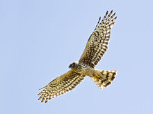 This is a typical harrier, which hunts on long wings held in a shallow V in its low flight during which the bird closely hugs the contours of the land below it. Northern or hen harriers hunt primarily small mammals, as do most harriers. Preferred prey species can include voles, cotton rats and ground squirrels. Up to 95% of the diet comprises small mammals.[13] However, birds are hunted with some regularity as well, especially by males. Preferred avian prey include passerines of open country (i.e. sparrows, larks, pipits), small shorebirds and the young of waterfowl and galliforms. Supplementing the diet occasionally are amphibians (especially frogs), reptiles and insects (especially orthopterans).[4] The species has been observed to hunt bats if these are available.[14] Larger prey, such as rabbits and adult ducks are taken sometimes and harriers have been known to subdue these by drowning them in water.[4] Harriers hunt by surprising prey while flying low to the ground in open areas, as they drift low over fields and moors.[3][8] The harriers circle an area several times listening and looking for prey.[8] Harriers use hearing regularly to find prey, as they have exceptionally good hearing for diurnal raptors, this being the function of their owl-like facial disc.[4] This harrier tends to be a very vocal bird while it glides over its hunting ground.