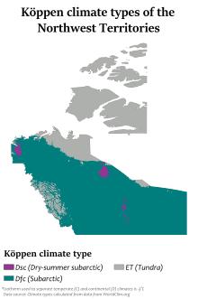 The Northwest Territories extends for more than 1,300,000 km2 (500,000 sq mi) and has a large climate variant from south to north. The southern part of the territory (most of the mainland portion) has a subarctic climate, while the islands and northern coast have a polar climate.