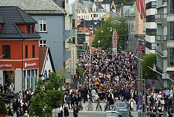 - ^ The Norwegian language has several distinct words for the English term "parade": "Parade", which refers to a military-like parade, and "tog" or "opptog", which refer to people walking in a predefined route just like a train moving along its track. The Norwegian word for "train", "tog", is derived from the Old Norse word for "rope"—indicating a row of people walking in a long line. The word "tog" was used of people walking in procession before the country ever got trains. In Bergen, the parade is known as a "prosesjon" (procession).