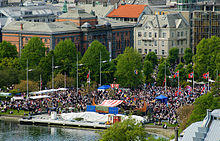 There has been dispute over whether foreign flags should be allowed in the parade. In 2008, the 17 May committee of Oslo banned the use of foreign flags, but was overturned by the mayor of Oslo, Fabian Stang.[17] Similar discussions have taken place in other cities.[18] In 2013, the 17 May committee of Ålesund turned down a request from a local school to use handmade paper flags that also included foreign flags.[19] The decision was later overturned.[20]