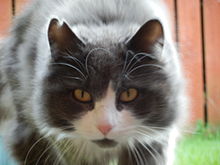 The Norwegian Forest cat is adapted to survive Norway's cold weather.[2][3] Its ancestors may include black and white shorthair cats brought to Norway from Great Britain some time after 1000 AD by the Vikings, and longhaired cats brought to Norway by Crusaders. These cats could have reproduced with farm and feral stock and may have eventually evolved into the modern-day Norwegian Forest breed.[4][5][6] The Siberian and the Turkish Angora, longhaired cats from Russia and Turkey, respectively, are also possible ancestors of the breed.[4] Norse legends refer to the skogkatt as a "mountain-dwelling fairy cat with an ability to climb sheer rock faces that other cats could not manage."[7] Since the Norwegian Forest cat is a very adept climber,[8][9] author Claire Bessant believes that the skogkatt folktale could be about the ancestor of the modern Norwegian Forest breed.[7] The name Norse skogkatt is used by some breeders and fancier organisations for the modern breed.