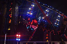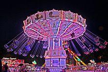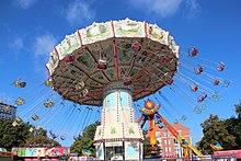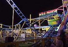 Rides for the more adventurous fair-goers include Speed XXL, a 3g spinning pendulum ride; XLR8, a 4g spinning drum ride; the Wild Mouse, a high-speed roller coaster with spinning carts; and the Reverse Bungee, an elasticated vertical catapult.[17] Magic, a suspended modern-day version of the Waltzer, first appeared at Goose Fair in 2017,[18] and a huge swinging/rotating disc ride called the Giant Frisbee was introduced the same year.[19]