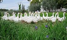 The first reference to the name "Goose Fair" can be found in the Nottingham Borough Records of 1541, where 21 September is referred to as "Goose Fair Day".[4][6] The name comes from the hundreds of geese that were driven on foot from Lincolnshire, Cambridgeshire and Norfolk to be sold in Nottingham. The birds' feet were coated with a mixture of tar and sand to protect them on the long journey of fifty miles or more.[6] It is recorded that up to 20,000 geese were driven up through Hockley and along "Goose Gate" into Nottingham's Old Market Square, where the fair was held annually for hundreds of years.[4][5] The geese were sold in Nottingham to provide the traditional Michaelmas dish of roast goose;[3] geese that had hatched in the spring were ready for the table by the end of September.[5] Michaelmas was celebrated on 29 September to mark the end of the harvest season.[6]