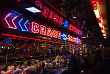 The many family attractions include traditional bumper cars, helter skelters, funhouses, ghost trains and waltzers.[12] There are several family stalls (such as Hook-a-duck) with prizes to be won, and a giant ferris wheel that provides an aerial view of the fair.[17] Conventional fairground food and refreshments are also on sale throughout the fair, including hot dogs, candy floss, doughnuts, and mushy peas with mint sauce.[1][12]