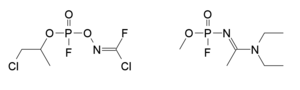 A wide range of potential structures have been reported. These all feature the classical organophosphorus core (sometimes with the P=O replaced with P=S or P=Se), which is most commonly depicted as being a phosphoramidate or phosphonate, usually fluorinated (cf. monofluorophosphate). The organic groups are subject to more variety; however, a common substituent is phosgene oxime or analogues thereof. This is a potent chemical weapon in its own right, specifically as a nettle agent, and would be expected to increase the harm done by the Novichok agent. Many claimed structures from this group also contain cross-linking agent motifs which may covalently bind to the acetylcholinesterase enzyme's active site in several places, perhaps explaining the rapid denaturing of the enzyme that is claimed to be characteristic of the Novichok agents.