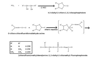 Mirzayanov provided the first description of these agents.[32] Dispersed in an ultra-fine powder instead of a gas or a vapour, they have unique qualities. A binary agent was then created that would mimic the same properties but would either be manufactured using materials which are not controlled substances under the CWC,[34] or be undetectable by treaty regime inspections.[45] The most potent compounds from this family, Novichok-5 and Novichok-7, are supposedly around five to eight times more potent than VX.[62] The "Novichok" designation refers to the binary form of the agent, with the final compound being referred to by its code number (e.g. A-232). The first Novichok series compound was in fact the binary form of a known V-series nerve agent, VR,[62] while the later Novichok agents are the binary forms of compounds such as A-232 and A-234.[63]