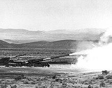 The first artillery test was on May 25, 1953 at the Nevada Test Site. Fired as part of Operation Upshot–Knothole and codenamed Shot GRABLE, a 280 mm (11 inch) shell with a gun-type fission warhead was fired 10,000 m (6.2 miles) and detonated 160 m (525 ft) above the ground with an estimated yield of 15 kilotons.[1] This was the only nuclear artillery shell ever actually fired in the U.S. nuclear weapons test program. The shell was 1384 mm (4.5 ft) long and weighed 365 kg (805 lb). It was fired from a special, very large artillery piece, nicknamed "Atomic Annie", built by the Artillery Test Unit of Fort Sill, Oklahoma. About 3,200 soldiers and civilians were present. The warhead was designated the W9 nuclear warhead and 80 were produced in 1952 to 1953 for the T-124 shell. It was retired in 1957.