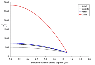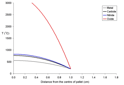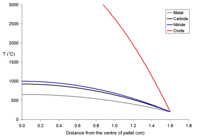 The temperature of the fuel varies as a function of the distance from the center to the rim. At distance x from the center the temperature (Tx) is described by the equation where ρ is the power density (W m−3) and Kf is the thermal conductivity.
