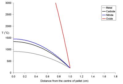 To explain this for a series of fuel pellets being used with a rim temperature of 200 °C (typical for a BWR) with different diameters and power densities of 250 Wm−3 have been modeled using the above equation. These fuel pellets are rather large; it is normal to use oxide pellets which are about 10 mm in diameter.