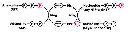 NDPK are found in all cells, displaying not much specificity towards the types of nucleoside bases and are capable of accepting nucleotides and deoxyribonucleotides as substrates or donors.[3] Therefore, NDPK is the source of RNA and DNA precursors, except ATP.[4] NDPK utilize specific enzyme kinetics for multi-substrate reaction, namely ping-pong mechanism. A ping-pong mechanism integrates phosphorylation of a histidine residue by transferring terminal phosphate group (γ-phosphate) from ATP to NDP β-phosphate in order to produce a NTP, and NDPK catalyzes such reversible reactions.[5] NTP phosphorylates a histidine, which in turn phosphorylates NDP. NDPK are involved in the synthesis of nucleoside triphosphates (NTP), such as guanosine triphosphate (GTP), cytidine triphosphate (CTP) and uridine triphosphate (UTP), thymidine triphosphate (TTP).[6]