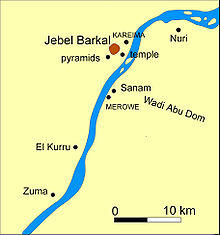- ^ Timothy Kendall; 2002; Napatan temples: A case study from Gebel Barkal. Gebel Barkal, the Mythological Nubian Origin of Egyptian kingship, and the Formation of the Napatan state; pp.67-69.