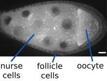 In respect to invertebrates, nurse cells are polytenic germline cells that contribute to the development of the oocyte, producing multiple nuclei. In fruit flies (Drosophila), nurse cells surround the developing oocyte and synthesize proteins and RNAs that are to be deposited in it.[2] Nurse cells are highly polyploid (up to 8000C). They dump their cytoplasm containing RNAs and proteins into the oocyte via ring canals.