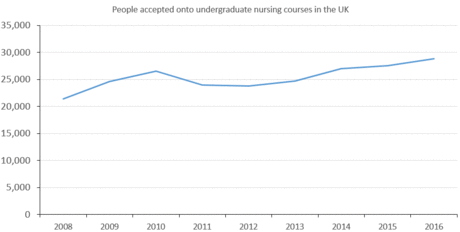 In England, Health Education England commission undergraduate and postgraduate education.[27] This is an autonomous national body which works to "ensure that healthcare staff are recruited in the right numbers with the right values and behaviours to support the delivery of excellent healthcare and drive improvement".[27] The number of commissioned places for nurses has varied year on year, as follows: