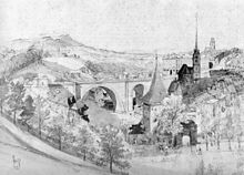 Following a three-year planning phase on 7 July 1840 the city appointed Karl Emanuel Müller as the lead engineer on the Nydegg Bridge project. Starting in August 1840, crews worked throughout the winter of 1840/41 to build coffer dams and prepare the foundations for the bridge pillars. Despite severe floods and other delays by May 1841 the pillars were in place and above water level. The cornerstone ceremony took place in early June of the same year. In the fall of 1841 construction began on the eastern side arch and by the following fall both the western and eastern side arches were finished. With the side arches finished, in the winter of 1842 workers began building the scaffolding for the larger central arch. By the summer of 1843, the central arch was completed and on 14–15 September 1843 the placing of the keystone was celebrated with cannon fire, speeches and a feast.[2] With major construction completed, the scaffolding was dismantled and work began on the decoration and roadway on the bridge. On 23 November 1844 the bridge was dedicated with a celebration attended by the entire city.[3] The entire project cost about 1,650,000 Franks.[4]