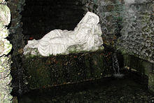 A motif that entered European art during the Renaissance was the idea of a statue of a nymph sleeping in a grotto or spring.[16][17][18] This motif supposedly came from an Italian report of a Roman sculpture of a nymph at a fountain above the River Danube.[19] The report, and an accompanying poem supposedly on the fountain describing the sleeping nymph, are now generally concluded to be a fifteenth-century forgery, but the motif proved influential among artists and landscape gardeners for several centuries after, with copies seen at neoclassical gardens such as the grotto at Stourhead.[20][21][22]