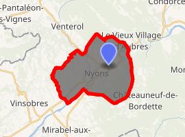 Nyons is a sub-prefecture of the department. It features two collèges and a lycée; as well as important shopping facilities and touristic attractions. Villages that are facilitated by Nyons are situated within an area of about 20 to 30 km (19 mi), such as Les Pilles, Aubres, Venterol and Mirabel-aux-Baronnies.
