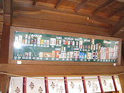 In a 'three-door' style (三社造 sansha-zukuri) altar, the Jingū Taima is placed in the middle, with the ofuda of one's local ujigami on its left (observer's right) and the ofuda of one's favorite shrine on its right (observer's left). Alternatively, in a 'one-door' style (一社造 issha-zukuri) kamidana, the three talismans are laid on top of one another, with the Jingū Taima on the front. One may own more shinsatsu; these are placed on either side of or behind the aforementioned three.[21][22][25][26][27] Regular (preferably daily) worship before the shinsatsu or kamidana and offerings of rice, salt, water, and/or sake to the kami (with additional foodstuffs being offered on special occasions) are recommended.[22][28] The manner of worship is similar to those performed in shrines: two bows, two claps, and a final bow, though a prayer (norito) - also preceded by two bows - may be recited before this.[29][30]