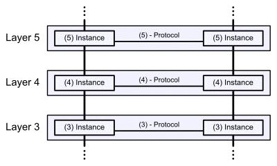 Communication protocols enable an entity in one host to interact with a corresponding entity at the same layer in another host. Service definitions, like the OSI Model, abstractly describe the functionality provided to an (N)-layer by an (N-1) layer, where N is one of the seven layers of protocols operating in the local host.