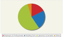 The 1831 census provides information, down to parish-level, on the occupations of males aged over 20 using nine categories. Here we reorganise this information to provide a crude measure of social status, based more on contemporary ideas than on modern definitions of social class: "middling sorts" combines small farmers not employing labourers with both masters and skilled workers in urban manufacturing and handicrafts.[3]