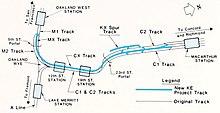 The station initially had one side platform on each level, with one track on the east side of each platform. The KE Track project, begun in 1980 and completed on March 17, 1986, converted the upper platform to an island platform with a new west track (Track CX).[10][4] The new track was originally used for peak hour service (southbound towards San Francisco in the morning, and northbound in the evening).[11]