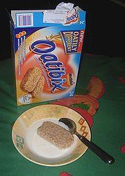 Weetabix is a whole-grain wheat breakfast cereal produced by Weetabix Limited in the United Kingdom. It comes in the form of palm-sized (approx. 9.5 cm × 5.0 cm or 4" × 2") rounded rectangle-shaped biscuits. Variants include organic and Weetabix Crispy Minis (bite-sized) versions.[1][2] The UK cereal is manufactured in Burton Latimer, Northamptonshire, and exported to over 80 countries.[3] Weetabix for Canada and the United States is manufactured in Cobourg, Ontario, in both organic and conventional versions.