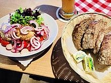 Sweet or hot paprika powder, salt and pepper are the traditional seasonings, as well as a small amount of beer.[1] An optional amount of onions, garlic, horseradish, cloves and ground or roasted caraway seeds may be used and some cream or cream cheese as well.[1] The cheeses and spices are mixed together into a more or less smooth mass according to taste. It is usually eaten spread on bread or pretzels. Obatzda is a classic example of Bavarian biergarten food.[2]