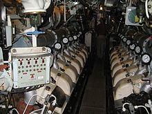 Each of the two propellers on the submarine is connected to a 3000-BHP DC electric motor. Each motor is designed with two separate armatures, in effect two motors in the same unit. Speed of the submarine can be varied by connecting the batteries and armatures in different series and parallel combinations. Slowest speed is obtained by connecting both batteries in parallel, thus supplying 440 V, across all four motor armatures in series, thus applying 110 V to each ('shafts in series'). Next, the batteries in parallel may be applied across the two motors in parallel, with their armatures in series ('group down'). This applies 220 V across each armature. Third, both batteries are applied in parallel across all four armatures applying 440 V to each ('group up'). Finally, the batteries can be arranged in series so as to apply 880 V across all four armatures in parallel ('batteries in series'). Each armature also has an associated field winding which is separately supplied with current which may be varied resistively, providing further speed control (maximum 35 A).