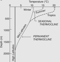 The denser cold water masses, formed by ocean surface water interaction with cold atmosphere in quite specific areas of the North Atlantic and the Southern Ocean, sink into the deep sea basins and spread in entire deep ocean by the thermohaline circulation. Upwelling of cold water from the deep ocean is replenished by the downwelling of cold surface sea water.