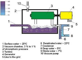 On March 22, 2015, Saga University opened a Flash-type desalination demonstration facility on Kumejima.[80] This satellite of their Institute of Ocean Energy uses post-OTEC deep seawater from the Okinawa OTEC Demonstration Facility and raw surface seawater to produce desalinated water. Air is extracted from the closed system with a vacuum pump. When raw sea water is pumped into the flash chamber it boils, allowing pure steam to rise and the salt and remaining seawater to be removed. The steam is returned to liquid in a heat exchanger with cold post-OTEC deep seawater.[81] The desalinated water can be used in hydrogen production or drinking water (if minerals are added).