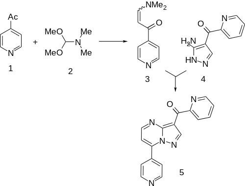 Condensation of 4-Acetylpyridine[8] with N,N-Dimethylformamide dimethyl acetal (DMFDMA) gives the "enamide" (3). This is then condensed with (3-Amino-1H-pyrazol-4-yl)(2-pyridinyl)methanone (4) (96219-90-8).[9][10] This is the same intermediate as was used in the synthesis of zaleplon in which the nitrile is replaced by a 2-acetylpyridil moiety. This affords the anxiolytic agent ocinaplon (5).