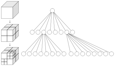 An octree is a tree data structure in which each internal node has exactly eight children. Octrees are most often used to partition a three-dimensional space by recursively subdividing it into eight octants. Octrees are the three-dimensional analog of quadtrees. The name is formed from oct + tree, but note that it is normally written "octree" with only one "t". Octrees are often used in 3D graphics and 3D game engines.