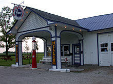 Early Odell was a railroad town and a grain collection point. It was surrounded by some of the richest agricultural land in the United States. By the late 1870s over a million and a half bushels of grain were being shipped from Odell. In 1877 a newspaper, the Odell Herald, was established.[18] In May 1886 several buildings in Odell were destroyed by a powerful tornado.[19] By 1900 there were 1,000 people in the town, and since that date its population has remained at about that number. The major change came not in population, but in transportation, as Odell made the transition from a railroad to a highway town. In 1921 the state put under contract a highway paving project for what at first was known as the "Chicago-Springfield East St. Louis Road".[20] Paving was finished through Odell in 1922. The designation of the road was soon changed to Route 4. In 1926, what was substantially the same road became Route 66. At first all of these roads passed through the center of Odell, and by 1933 the local citizens became so frustrated by the inability of people to cross the road that they constructed a pedestrian underpass beneath the highway.[21] In 1946 the problem was eased when a bypass was built around the town. In 1932 Patrick O'Donnell built the Standard Oil and Gasoline Station to serve traffic along the highway; this building has now been carefully restored and has become a popular stop for visitors touring Route 66. The station was added to the National Register of Historic Places in 1997. In 1964 the first stage of Interstate 55 was completed past Odell.[22] It was improved in the 1970s. This highway substantially paralleled both the earlier roads and the original route of the Chicago and Mississippi Railroad.