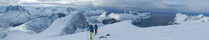 Backcountry skiing (US), also called off-piste (Europe), alpine touring, or out-of-area, is skiing in the backcountry on unmarked or unpatrolled areas either inside or outside a ski resort's boundaries.[1] This contrasts with alpine skiing which is typically done on groomed trails benefiting from a ski patrol. Unlike ski touring, backcountry skiing can include the use of ski lifts including snowcats and helicopters. Recent improvements in equipment have increased the popularity of the sport.[2]