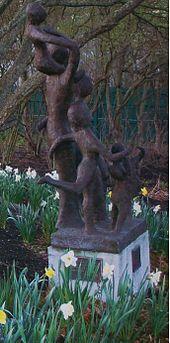 The Water Garden sits to the north of the patio and consists of 6 pools with 2 large urns in the corners to recirculate the water. The water garden features a diverse collection of aquatic plants. The Black Swamp Garden is located to the east of the patio, and above this is a crab apple grove with the sculpture named “To Life.” This sculpture by Alfred Tibor depicts a father with a child on his shoulders, a mother, and two children playing around them.