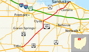 State Route 101 (SR 101) is a southwest-northeast (signed east–west) state highway in the north central portion of the U.S. state of Ohio. Its western terminus is at the junction of SR 18 and SR 53 in Tiffin; it runs concurrently with SR 18 for about one mile (1.6 km). Its eastern terminus is at the junction of U.S. Route 6 (US 6) and SR 4 in Sandusky; it runs concurrently with US 6 for just over one and a half miles (2.4 km) to its western terminus.