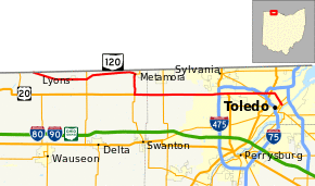 State Route 120 (SR 120) is an east–west state highway in the northwestern portion of the U.S. state of Ohio. Its western terminus is at the Michigan state line, where an unnumbered county highway (Morenci Road, formerly M-120) continues west-northwest. State Route 120’s eastern terminus is in Toledo at State Route 65; the route is, for all practical purposes, a spur of U.S. Route 20, which generally bypasses Toledo to the west and south.